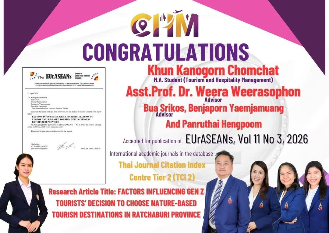 วิทยาลัยการจัดการอุตสาหกรรมบริการ หลักสูตรศิลปศาสตรมหาบัณฑิต (การท่องเที่ยวและบริการ) ขอแสดงความยินดีกับ คุณกนกอร ชมชาติ นักศึกษาหลักสูตรศิลปศาสตรมหาบัณฑิต (การท่องเที่ยวและบริการ) ผศ.ดร.วีระ วีระโสภณ และดร.บัว ศรีคช (อาจารย์ปรึกษา) เนื่องในโอกาสงานวิจัยได้รับใบตอบรับ และตีพิมพ์ในวารสารระดับชาติ เรื่อง "FACTORS INFLUENCING GEN Z TOURISTS’ DECISION TO Siam Technology College, Bangkok, Thailand CHOOSE NATURE-BASED TOURISM DESTINATIONS IN RATCHABURI PROVINCE "