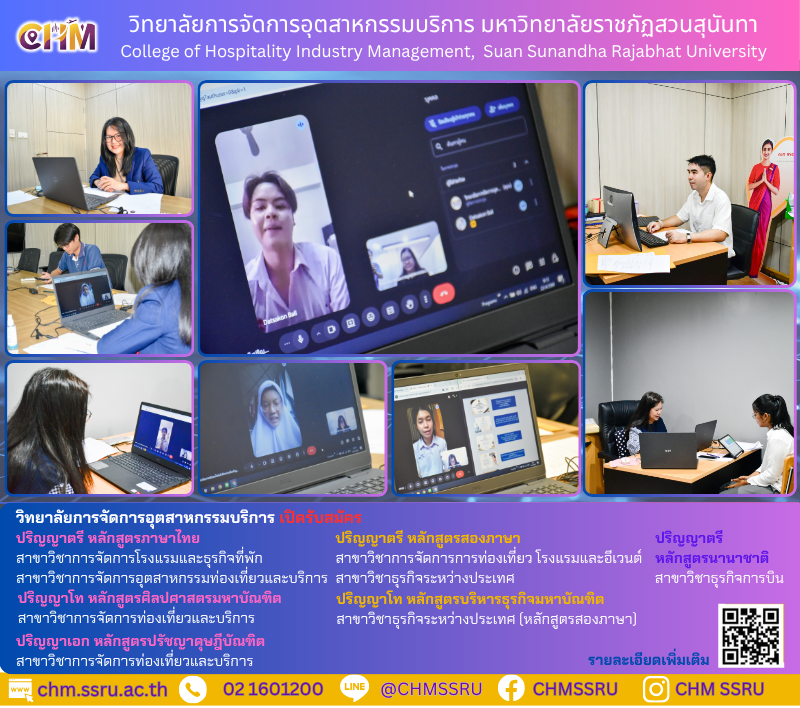 วันพุธที่ 22 เมษายน 2569 วิทยาลัยการจัดการอุตสาหกรรมบริการ มหาวิทยาลัยราชภัฏสวนสุนันทา จัดสอบสัมภาษณ์นักศึกษา (ภาคปกติ) ระดับปริญญาตรี ประจําปีการศึกษา 2569 รอบที่2 (Quotal ) ผ่านระบบ Google Meet